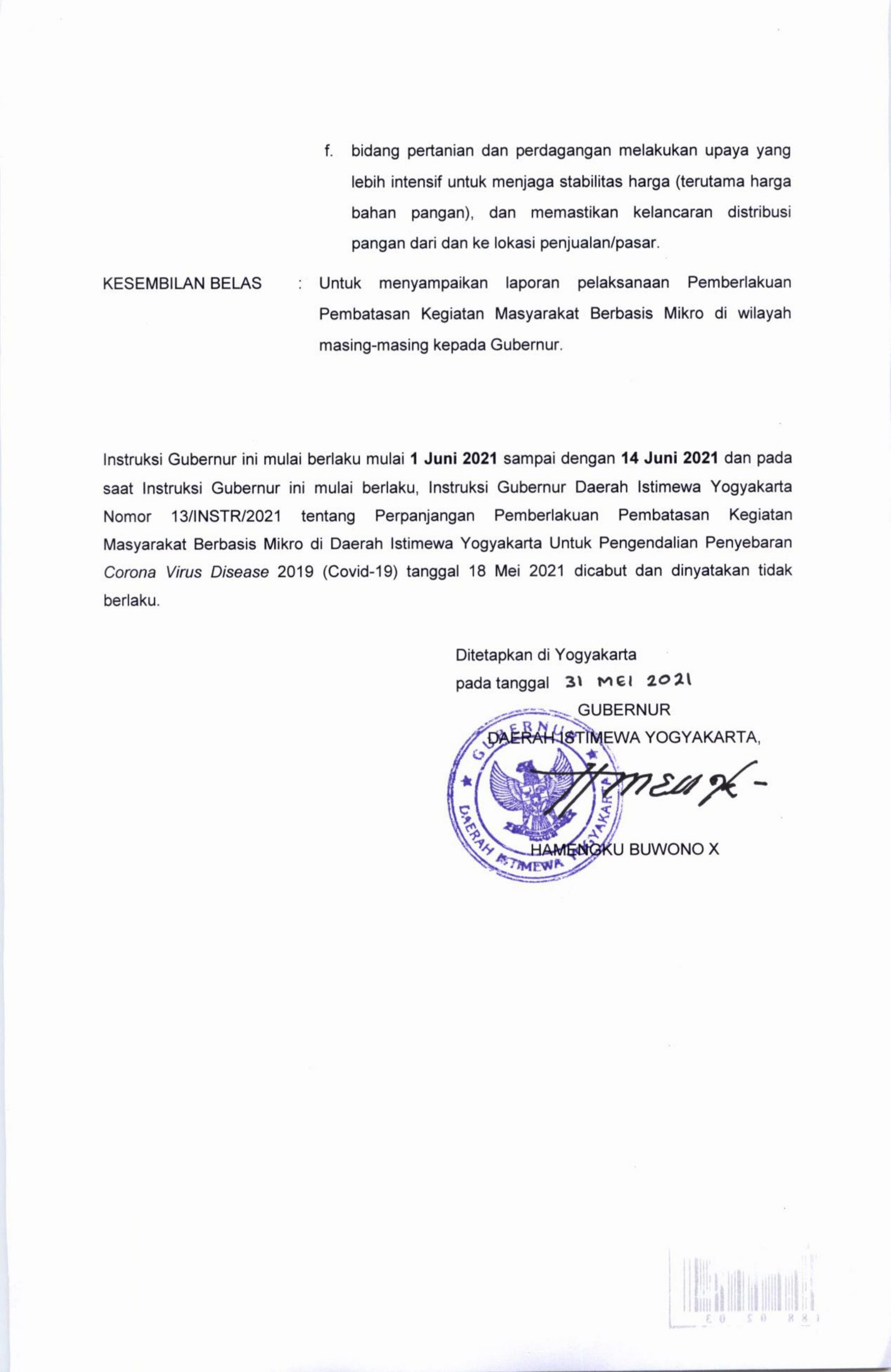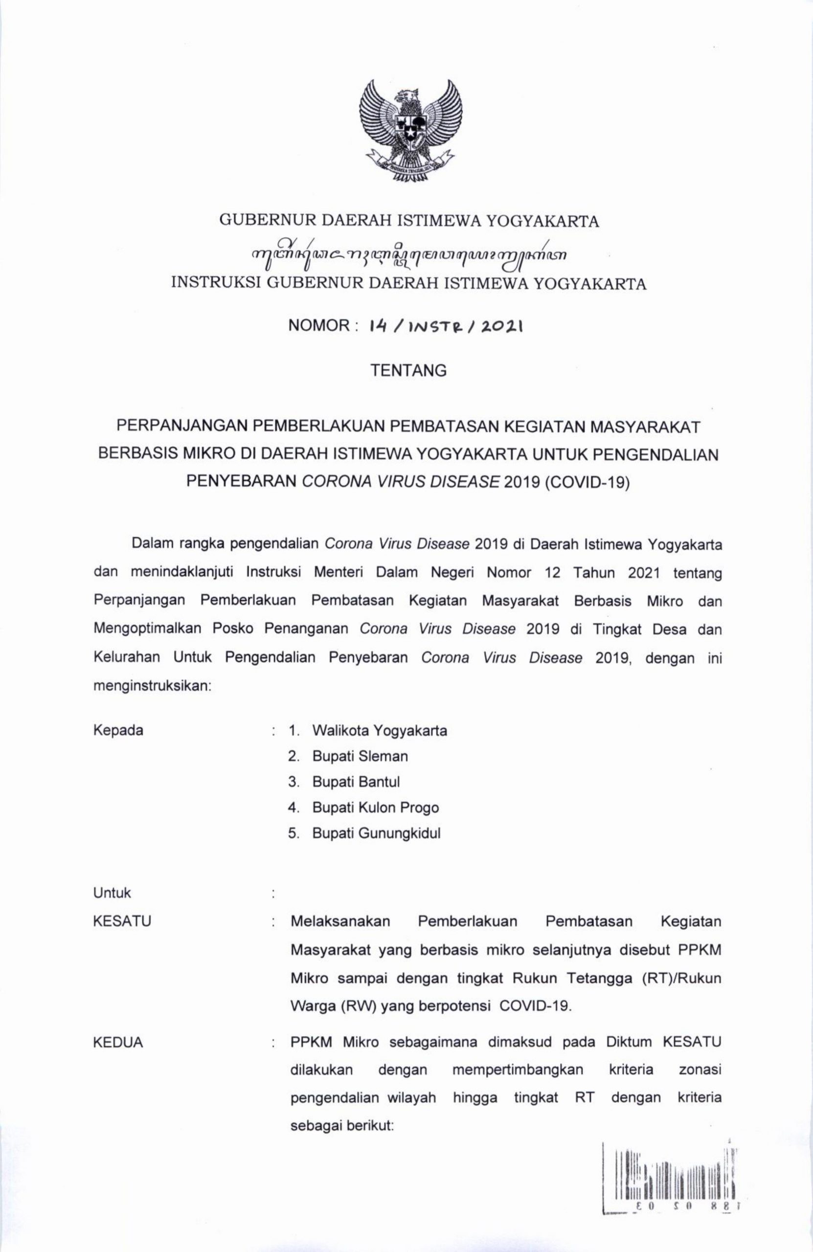 Sesuai dengan Instruksi Gubernur DIY No. 14/INSTR/2021 Pemberlakukan Pembatasan Kegiatan Masyarakat (PPKM) Mikro kembali diperpanjang mulai dari 1 Juni hingga 14 Juni 2021